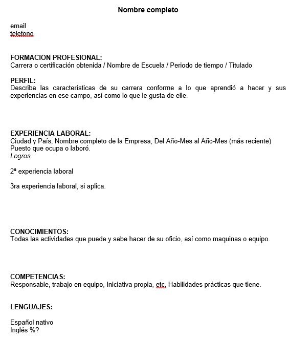 3 – Experiencia laboral (los tres empleos mas recientes) por orden cronológico, comenzando con el trabajo mas reciente. Será valioso incluir el nombre de la empresa, puesto de trabajo, periodo laborado y algunas de las actividades que describan estas experiencias.